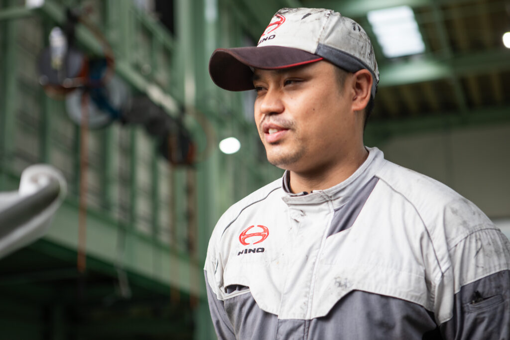 入社して6年になります。入社のきっかけは会社説明会でした。トラックの分解作業など、専門的な仕事に挑戦できると聞き、「自分もやってみたい」と思ったのが始まりです。私は小さい頃から日本で育ち、専門学校で二級整備士の資格を取得しました。卒業後はそのまま日野に入り、ずっと整備の仕事に携わっています。