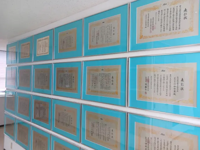 弊社では本社本館の3階に、メーカーである日野自動車㈱様から贈られた表彰状や感謝状を掲示していますが、このたび、それらの額の入れ替え作業および、レイアウト整理を…
