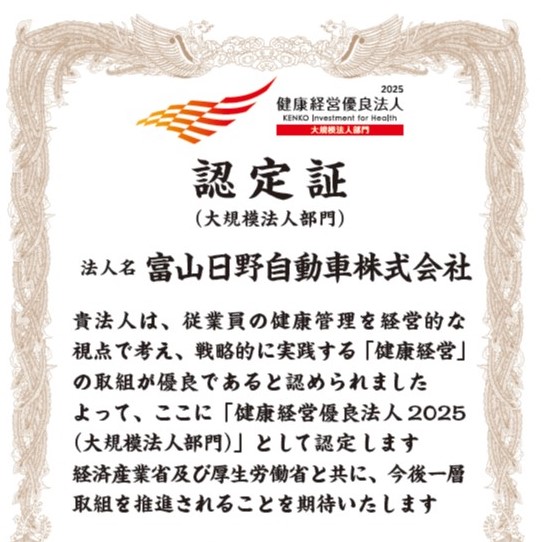 この度、富山日野自動車は昨年に引き続き「健康経営優良法人2025(大規模法人部門)」の認定をいただきました。 「健康経営優良法人認定制度」とは、地域の健…