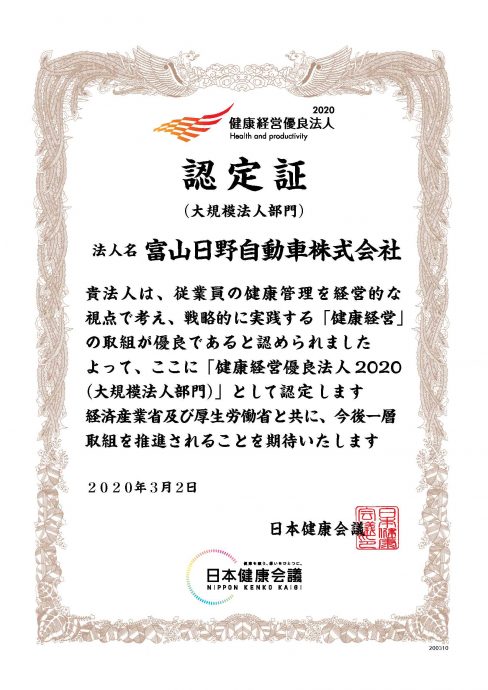 この度、富山日野自動車は、「健康経営優良法人2020(大規模法人部門)」の