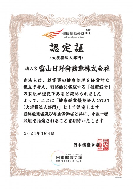 この度、富山日野自動車は昨年に引き続き「健康経営優良法人2021(大規模法人部門)」の認定をいただきました。
