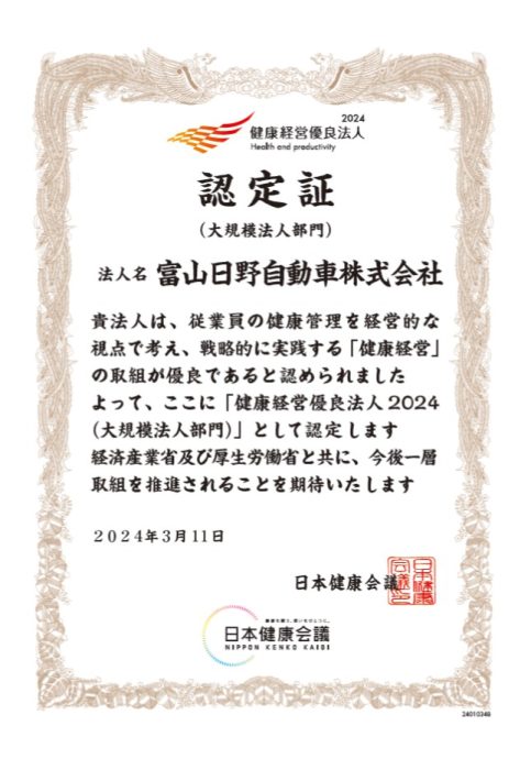 この度、富山日野自動車は昨年に引き続き「健康経営優良法人2024(大規模法人部門)」の認定をいただきました。