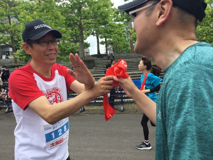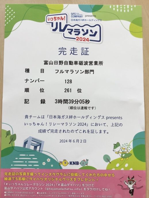 2024年6月2日(日)、弊社砺波営業所チーム初の試みで5000人以上が出場する「いっちゃん!リレーマラソン2024」に参加しました。悪天候の中での始まりでしたが、フルマラソンがスタートする頃には雨も上がり、お揃いの帽子をかぶり、皆でゴールを目指して頑張ることができました。無事完走する事ができ、楽しい一日となりました。