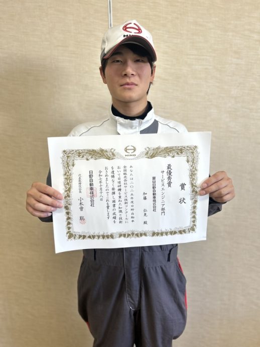 10月16日(木)~18日(土)に開催された「全国販売会社サービス技術コンクール」において、 弊社の加藤選手がメカニック部門で全国1位を獲得いたしました