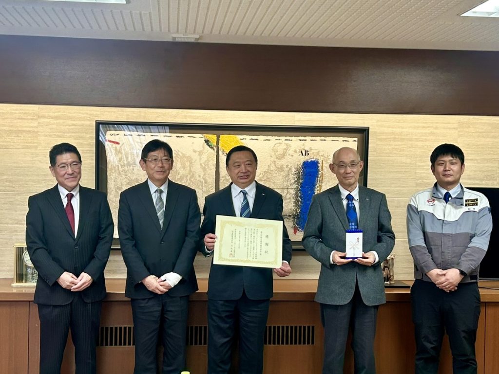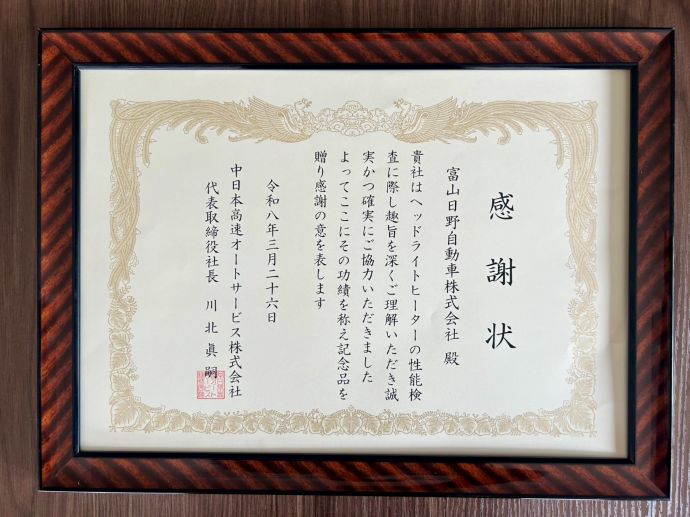 本感謝状は、中日本高速オートサービス株式会社様が独自で研究・開発をされたヘッドランプ用ヒーターの実用化に向け、法規検査および調査に協力したことが評価され、贈呈されたものです。