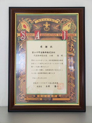 平成31年4月28日、日本ボーイスカウト富山県連盟様より長年の活動支援に対する