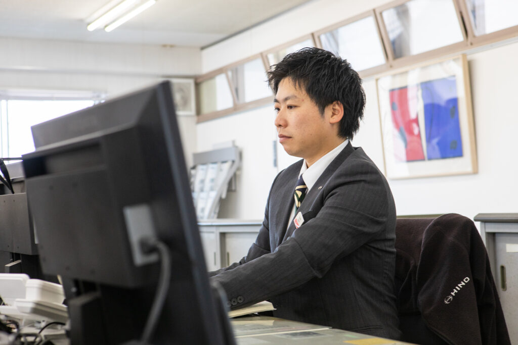 入社してすぐは営業ではなく「業務部」に配属されました。そこで新車に触れながら、どんなトラックがあるのか、基本的な仕様や流れを一から覚えていきました。最初の2年間は、事務作業や、納車・洗車の手伝いなどを通して、トラックに慣れていく期間だったと思います。